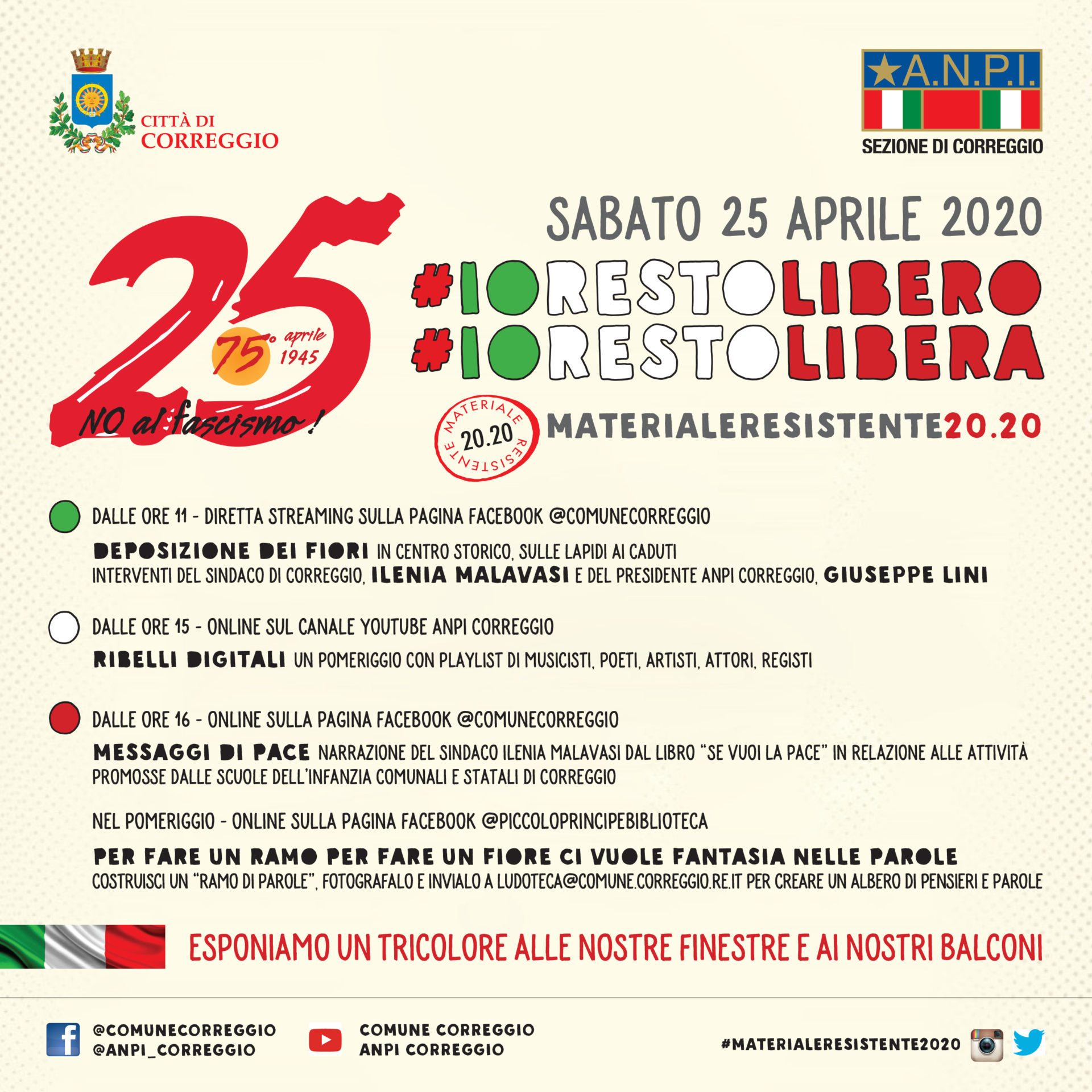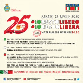 Sarà una Festa della Liberazione necessariamente diversa – sabato 25 aprile – per il rispetto dovuto al lockdown e alle prescrizioni per il contenimento della diffusione del coronavirus. Ugualmente, però, l’amministrazione comunale di Correggio e Anpi Correggio si preparano a #materialeResistente2020, una giornata di appuntamenti online e in streaming, con un titolo, #iorestolibero #iorestolibera, che intende sottolineare ulteriormente il valore del 75esimo anniversario della Liberazione, invitando i cittadini a esporre il tricolore dalle proprie abitazioni.