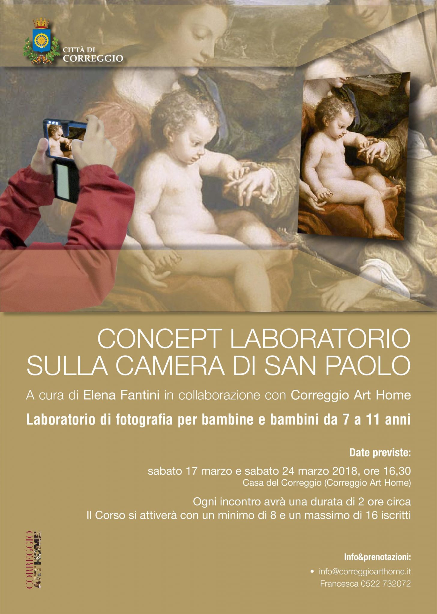 Infine, per i più piccoli è previsto un “concept-laboratorio sulla Camera di San Paolo“, ovvero un laboratorio di fotografia per da 7 a 11 anni, a cura di Elena Fantini: sabato 17 marzo e sabato 24 marzo. Ogni incontro avrà una durata di 2 ore circa. Il corso si attiverà con un minimo di 8 e un massimo di 16 iscritti.