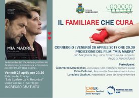 Per favorire una conoscenza e un confronto su cosa significa essere “caregiver”, assistere una persona cara che soffre, dover prendere difficili decisioni che impattano sulla sua qualità di vita, vedere cambiate le proprie aspettative, le relazioni familiari, quelle amicali, a volte dover affrontare la fase terminale della vita di una persona cara, venerdì 28 aprile, ore 20,30, nella sala conferenze A. Recordati di Palazzo dei Principi, verrà proiettato il film “Mia madre” di Nanni Moretti. La proiezione sarà anticipata da un saluto del vicesindaco e assessore a welfare e coesione sociale del Comune di Correggio, Gianmarco Marzocchini. Al termine del film, un intervento di Katia Pelliciari, responsabile del Servizio Anziani del Servizio Sociale Integrato dell’Unione Comuni Pianura Reggiana, aprirà il dibattito, che sarà poi condotto da Loredana Ligabue (direttore della cooperativa “Anziani e non solo”).