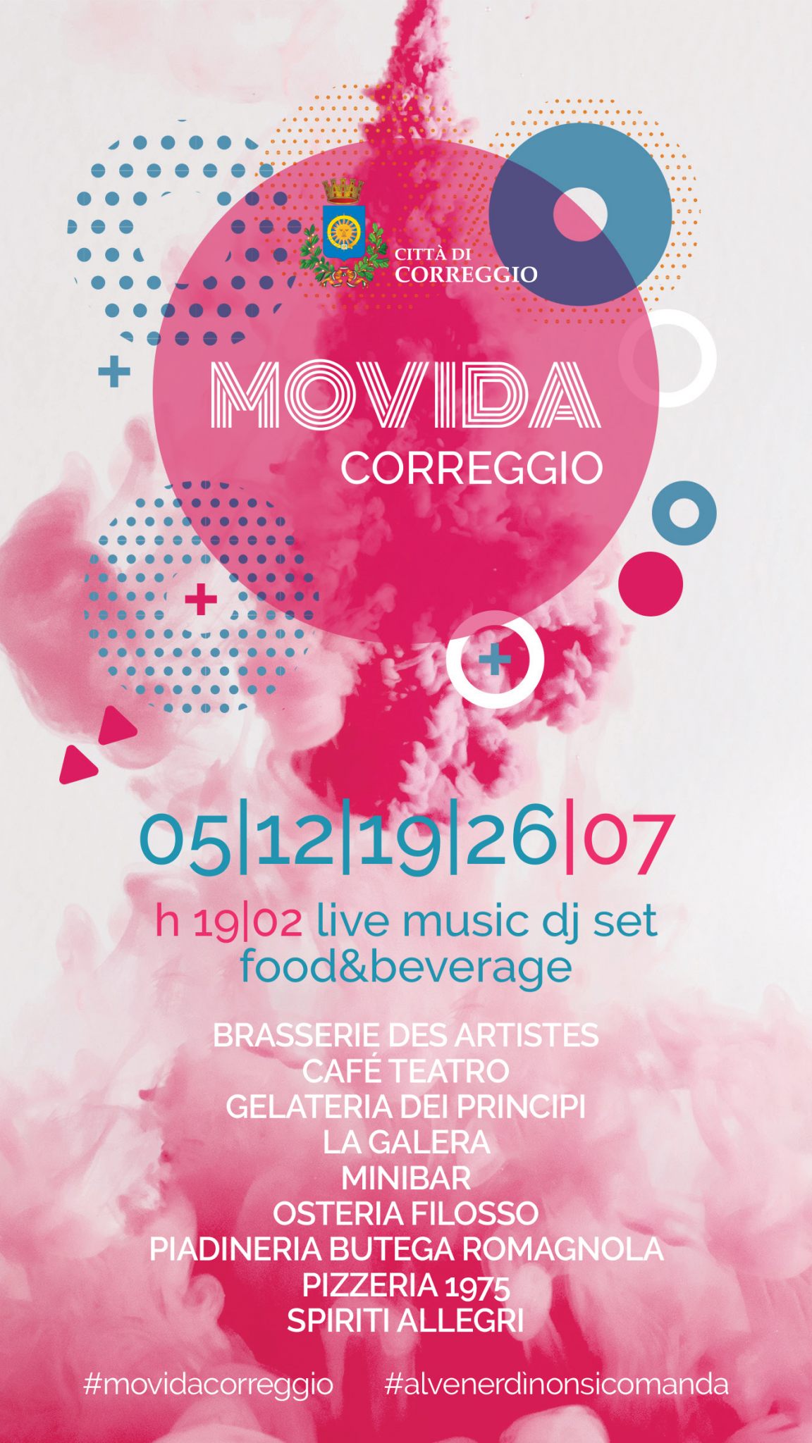 Quattro venerdì sera da vivere a Correggio, tra corso Cavour e piazza San Quirino, grazie al ritorno della #MovidaCorreggio, l’iniziativa che vedrà nei venerdì di luglio live music, dj set, food&beverage promossi da Brasserie des Artistes, Cafè Teatro, Gelateria dei Principi, La Galera, Osteria Filosso, Minibar, Piadineria Butega Romagnola, Pizzeria 1975 e Spiriti Allegri. Dal 5 al 26 luglio, ogni venerdì, dalle ore 19, quattro serate che vedranno il centro di Correggio animarsi grazie alla collaborazione messa in campo tra le attività economiche della zona e il Comune di Correggio.