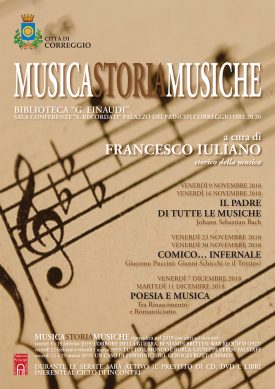 Dopo l’ottimo successo riscontrato lo scorso anno, ritorna “MusicaStorieMusiche” il nuovo ciclo di serate dedicate alla musica classica promosso dal Comune di Correggio e condotto da Francesco Iuliano, storico della musica e docente al Conservatorio di Mantova. Si tratta di tre appuntamenti – che si svolgono alle ore 20,30 a Palazzo dei Principi, nella sala conferenze “A. Recordati” – in cui sarà possibile approfondire la conoscenza della musica, raccontando le storie dei suoi protagonisti e dei capolavori da essi scritti. Ogni tema sarà sviluppato nell’arco di due incontri: venerdì 9 e venerdì 16 novembre, “Il padre di tutte le musiche – Johann Sebastian Bach”; venerdì 23 e venerdì 30 novembre, “Comico… Infernale – Giacomo Puccini: Gianni Schicchi (e il Trittico)”; venerdì 7 e martedì 11 dicembre, “Poesia e musica – tra Rinascimento e Romanticismo”.