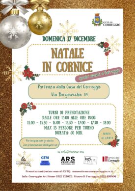 Domenica 17 dicembre il centro storico sarà animato da un evento dedicato all’illustre artista della nostra città che ne porta il nome, Antonio Allegri detto il Correggio. I quadri del Correggio prenderanno vita, con divertenti azioni teatrali, partendo dalla Casa del Correggio ogni mezz’ora a partire dalle ore 15.