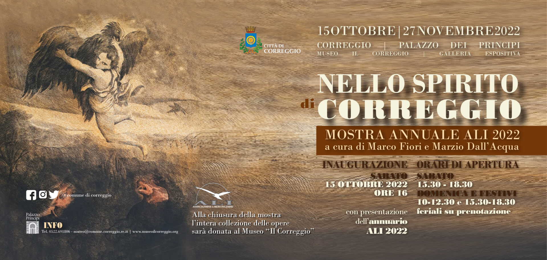L’inaugurazione sarà anche l’occasione per la presentazione dell’annuario ALI, volume pubblicato fin dalla costituzione di ALI e che, fino ad oggi, conta 32 libri tematici. L’annuario presenterà ovviamente tutte le opere in mostra, oltre a una serie di saggi storici e critici su Correggio e sui suoi numerosi talenti, tra cui un’inedita e originale relazione prodotta da studiosi delle Accademie d’arte polacche su Antonio Allegri e sull’arte incisoria