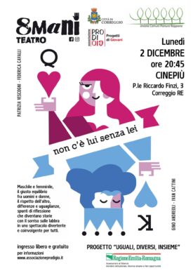 Lo spettacolo è organizzato nell’ambito di Uguali Diversi Insieme, progetto finanziato dalla Regione Emilia Romagna che vede Correggio comune capofila, con tutti i comuni dell’Unione, in collaborazione con l’associazione ProdiGio, che realizza interventi nelle scuole e formazioni di docenti nelle secondarie di secondo grado con l’obiettivo di sensibilizzare il più possibile sul tema della cultura del rispetto, della parità di genere, della lotta alla violenza contro le donne.