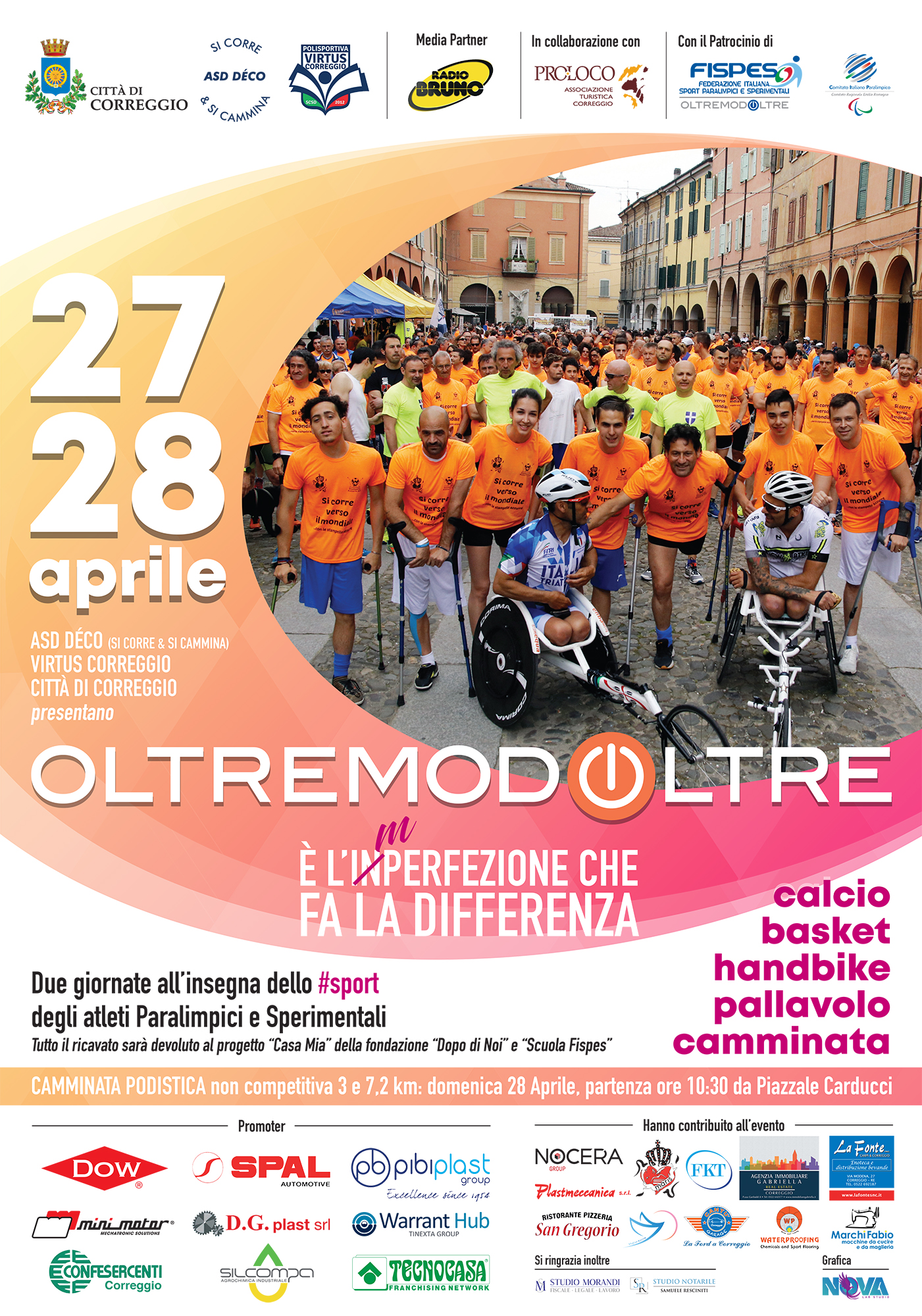 Sabato 27 e domenica 28 aprile, Correggio si trasforma in una piccola capitale dello sport, degli atleti paralimpici e sperimentali e della solidarietà grazie a “OltremodOltre”, iniziativa promossa da Comune di Correggio, Gruppo Si Corre e si Cammina e Virtus Correggio, in collaborazione con Pro Loco e Radio Bruno e con il patrocinio di Fispes (Federazione Italiana Sport Paralimpici e Sperimentali) e Comitato Italiano Paralimpico.