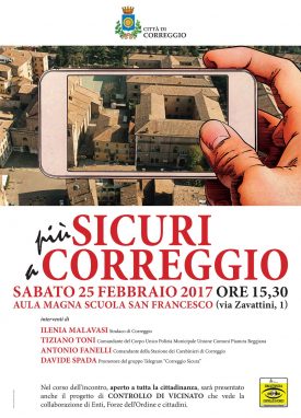 Il tema della sicurezza è al centro di “Più sicuri a Correggio”, incontro pubblico promosso dal Comune di Correggio, sabato 25 febbraio, alle ore 15,30, nell’aula magna della scuola primaria San Francesco (via Zavattini, 1).