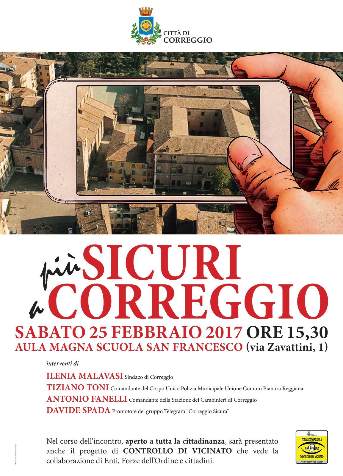 L’iniziativa vedrà gli interventi di Ilenia Malavasi, sindaco di Correggio, Tiziano Toni, comandante del Corpo Unico di Polizia Municipale dell’Unione Comuni Pianura Reggiana, Antonio Fanelli, maresciallo dei Carabinieri di Correggio, e Davide Spada, promotore del gruppo Telegram “Correggio sicura”, tra i primi sostenitori del progetto “Controllo di vicinato”. Nel corso dell’incontro si svolgerà, infatti, anche la presentazione di questa iniziativa che prenderà il via nelle settimane successive.