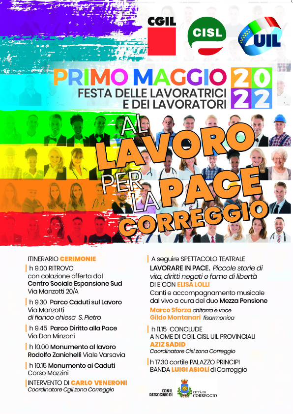 Domenica 1 maggio, “Lavoro per la pace” è il titolo della festa dei lavoratori promossa da CGIL, CISL e UIL a Correggio.