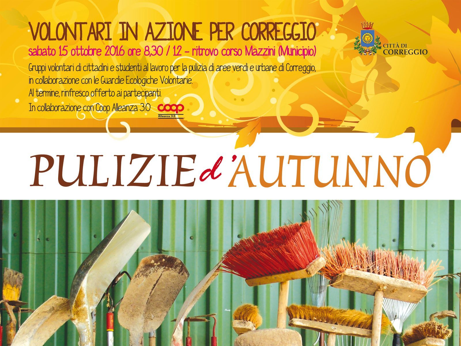 Sabato 15 ottobre è tempo di “Pulizie d’autunno” a Correggio. Dalle ore 8,30, infatti, con ritrovo in corso Mazzini, di fronte al Municipio, gruppi volontari di cittadini e studenti si metteranno al lavoro, in collaborazione con le Guardie Ecologiche Volontarie, dedicandosi alla pulizia di aree verdi e urbane di Correggio precedentemente individuate.