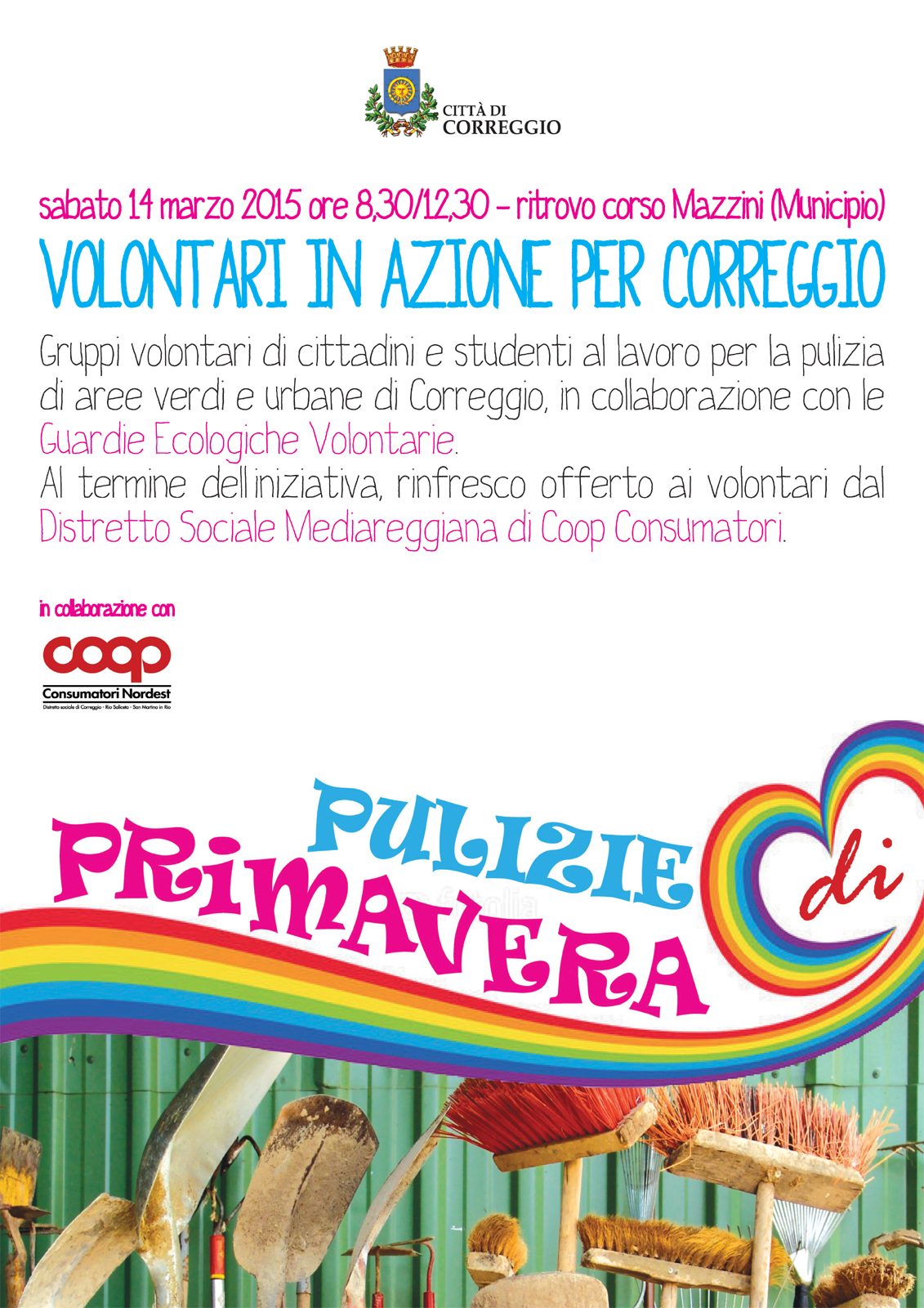 Sabato 14 marzo sarà tempo di “Pulizie di primavera” a Correggio. Dalle ore 8,30, infatti, con ritrovo in corso Mazzini, di fronte al Municipio, gruppi volontari di cittadini e studenti si metteranno al lavoro, in collaborazione con le Guardie Ecologiche Volontarie, dedicandosi alla pulizia di aree verdi e urbane di Correggio precedentemente individuate dall’amministrazione comunale.
