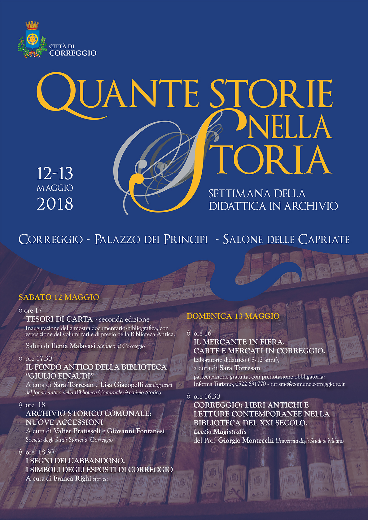 Il via sabato 12 maggio, alle ore 17, con la seconda edizione di “Tesori di carta”, la mostra documentario-bibliografica con esposizione dei volumi rari e di pregio conservati nella biblioteca antica di Correggio. a seguire tra comunicazioni: “Il fondo antico della Biblioteca Giulio Einaudi”, a cura di Sara Torresan e Lisa Giacopelli, catalogatrici del fondo antico della biblioteca comunale e dell’Archivio Storico, “Archivio storico comunale: nuove accessioni”, a cura di Valter Pratissoli e Giovanni Fontanesi, della Società di Studi Storici di Correggio, e “I segni dell’abbandono. I simboli degli esposti a Correggio”, a cura di Franca Righi, storica locale.