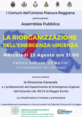 Mercoledì 23 agosto, dalle 21, al centro sociale XXV Aprile, in via Campagnola a Correggio (e diretta streaming sul canale youtube del Comune di Correggio), i cittadini avranno l’opportunità di approfondire l’argomento della riorganizzazione del sistema di Emergenza-Urgenza con la Direzione Generale e i professionisti del Dipartimento di Emergenza Urgenza dell’Azienda USL IRCCS di Reggio Emilia in un’assemblea pubblica fortemente voluta e organizzata dai Sindaci dell’Unione Pianura Reggiana.