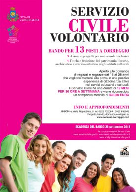 È aperto un bando – riservato alle domande di ragazzi e ragazze dai 18 ai 28 anni – per tredici posti di Servizio Civile Volontario da svolgersi presso ISECS del Comune di Correggio.
