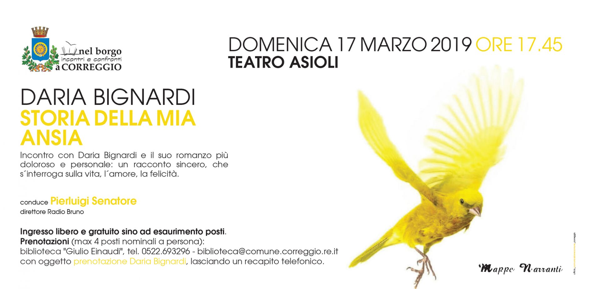 Evento molto atteso, a Correggio, domenica 17 marzo, quando, alle ore 17,30, al Teatro Asioli, sarà ospite Daria Bignardi per presentare il suo ultimo romanzo, “Storia della mia ansia” (Mondadori). A condurre l’iniziativa, tra intervista e reading, Pierluigi Senatore, giornalista.