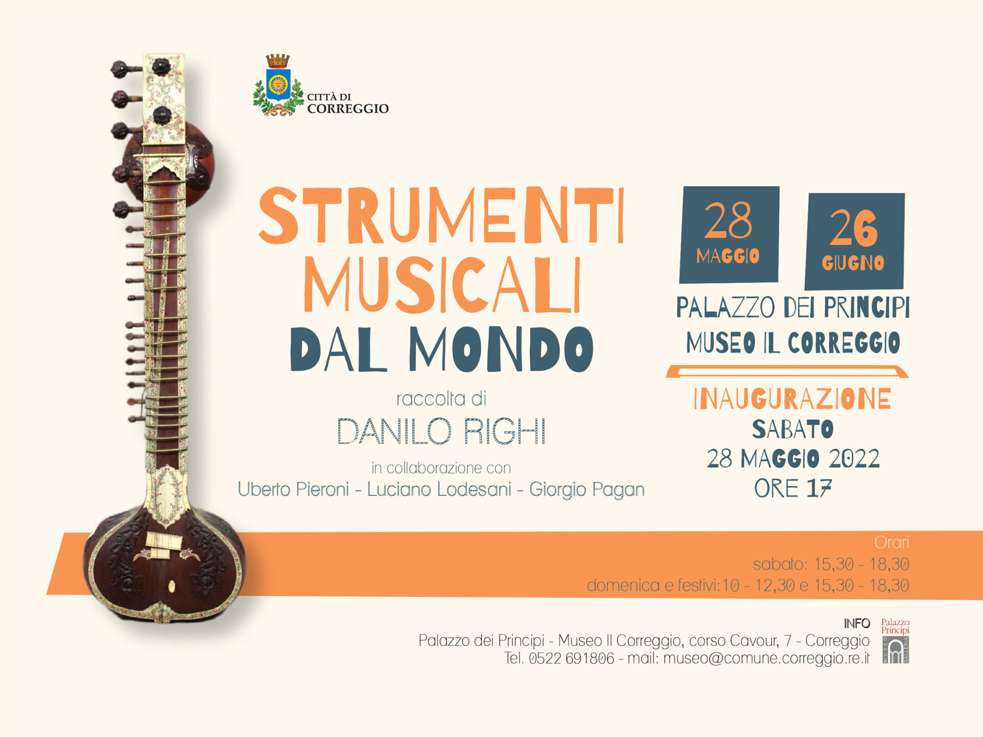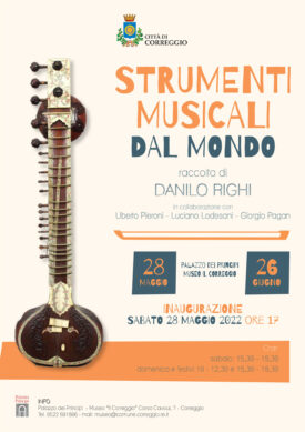 Apre sabato 28 maggio – con inaugurazione alle ore 17 – “Strumenti musicali dal mondo” – esposizione di strumenti musicali provenienti dalla raccolta privata di Danilo Righi, allestita al Museo Il Correggio fino al prossimo 26 giugno, con la collaborazione di Uberto Pieroni, Luciano Lodesani e Giorgio Pagan.