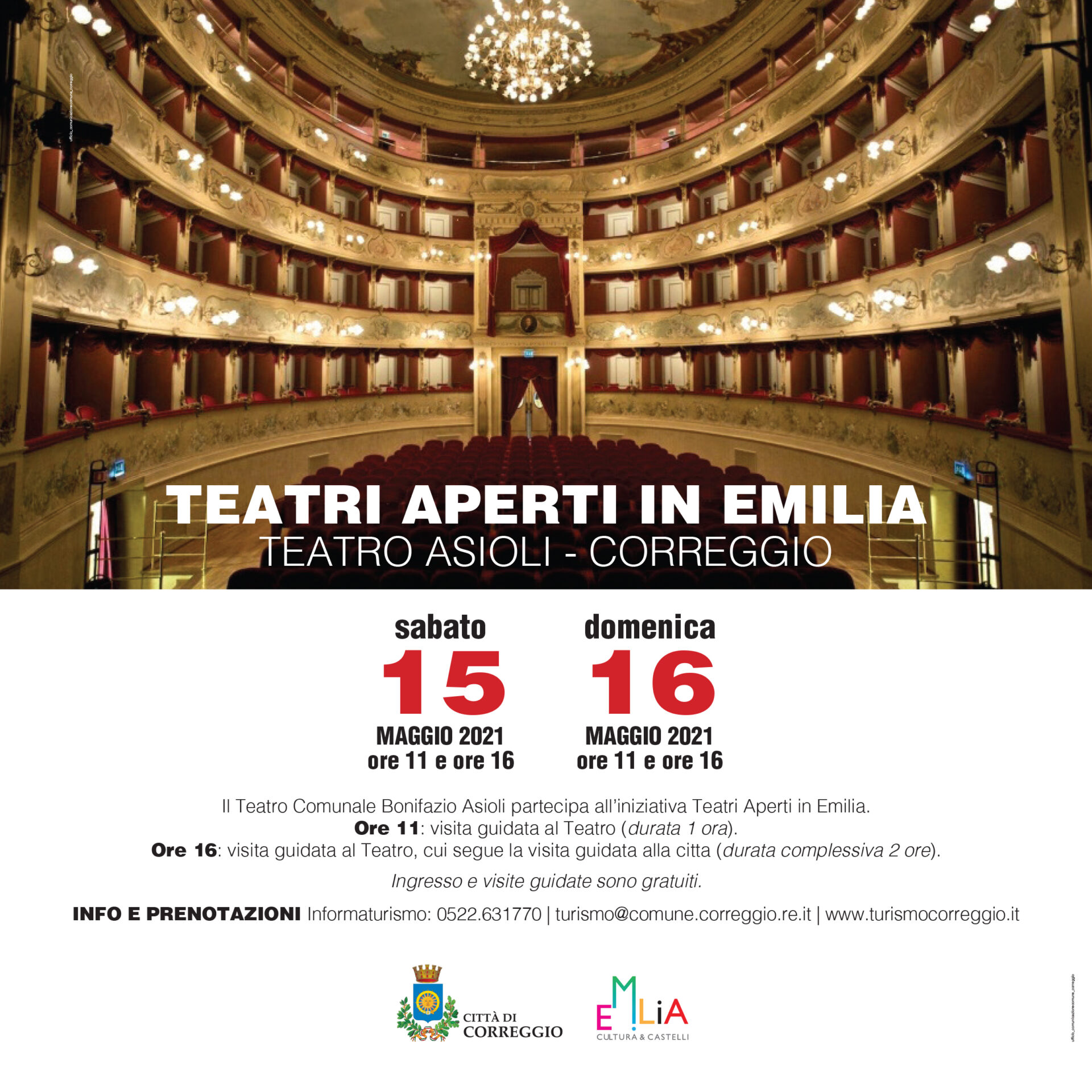 Il Teatro Asioli di Correggio partecipa all’iniziativa “Teatri Aperti in Emilia”, weekend di maggio alla scoperta di 23 teatri storici delle province di Piacenza, Parma e Reggio Emilia, coordinati da Visit Emilia: il programma a Correggio vede, sabato 15 e domenica 16 maggio, alle ore 11 e alle ore 16 la visita guidata al Teatro Asioli (durata 1 ora); alle ore 16, dopo quella al Teatro, i partecipanti avranno la possibilità di allungare il tour con una visita guidata alla città, per una durata complessiva di due ore.