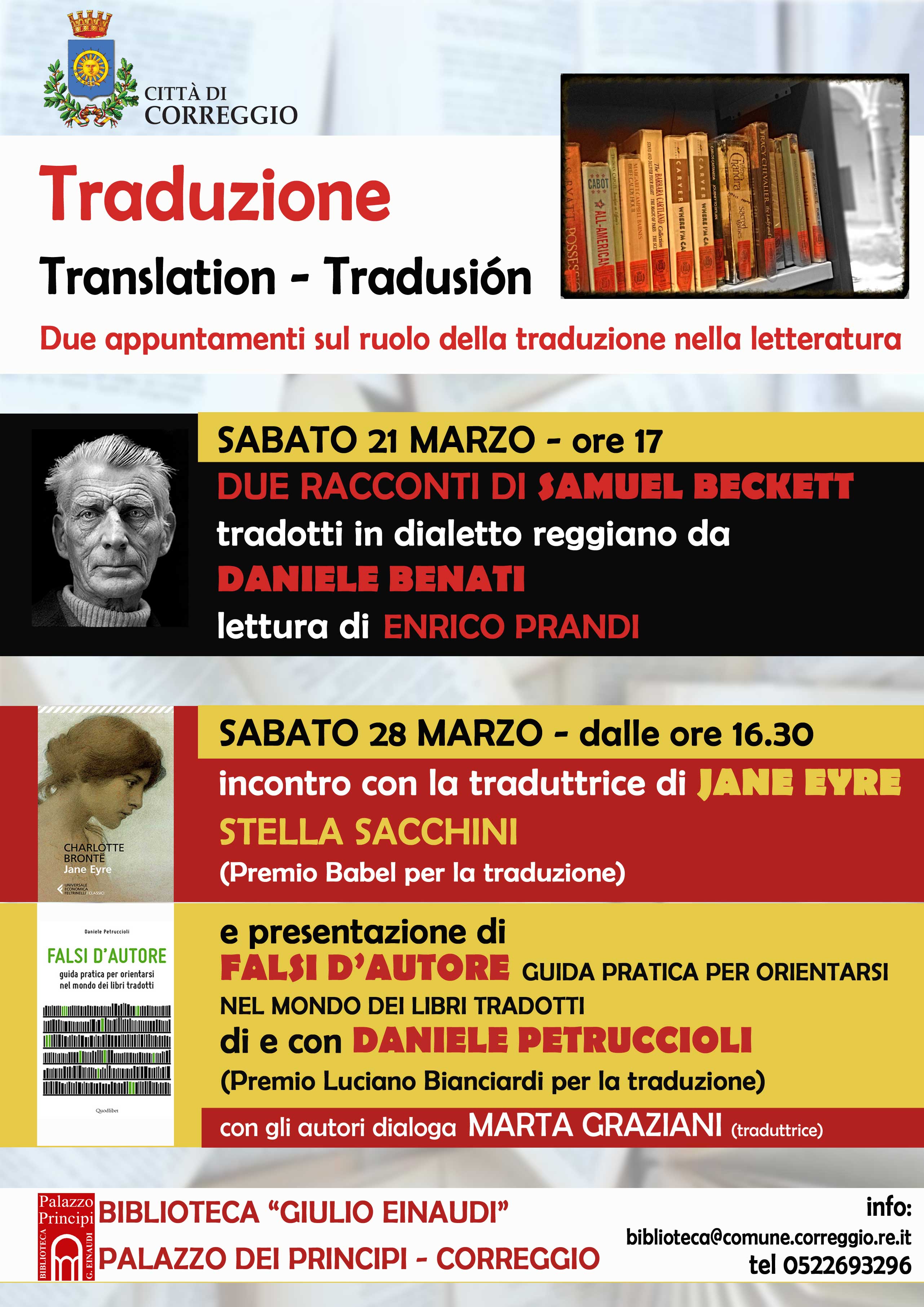 Sono dedicati all’importanza della traduzione nella letteratura i due appuntamenti promossi dalla biblioteca comunale “Giulio Einaudi” di Correggio: sabato 21 marzo, alle ore 17, “Due racconti di Samuel Backett” tradotti in dialetto reggiano da Daniele Benati, con letture di Enrico Prandi; sabato 28 marzo, dalle ore 16,30, incontro con Stella Sacchini, traduttrice di Jane Eyre e “Premio Babel” per la traduzione, e, a seguire, presentazione di “Falsi d’autore”, guida pratica per orientarsi nel mondo dei libri tradotti, di e con Daniele Petruccioli, “Premio Luciano Bianciardi” per la traduzione.