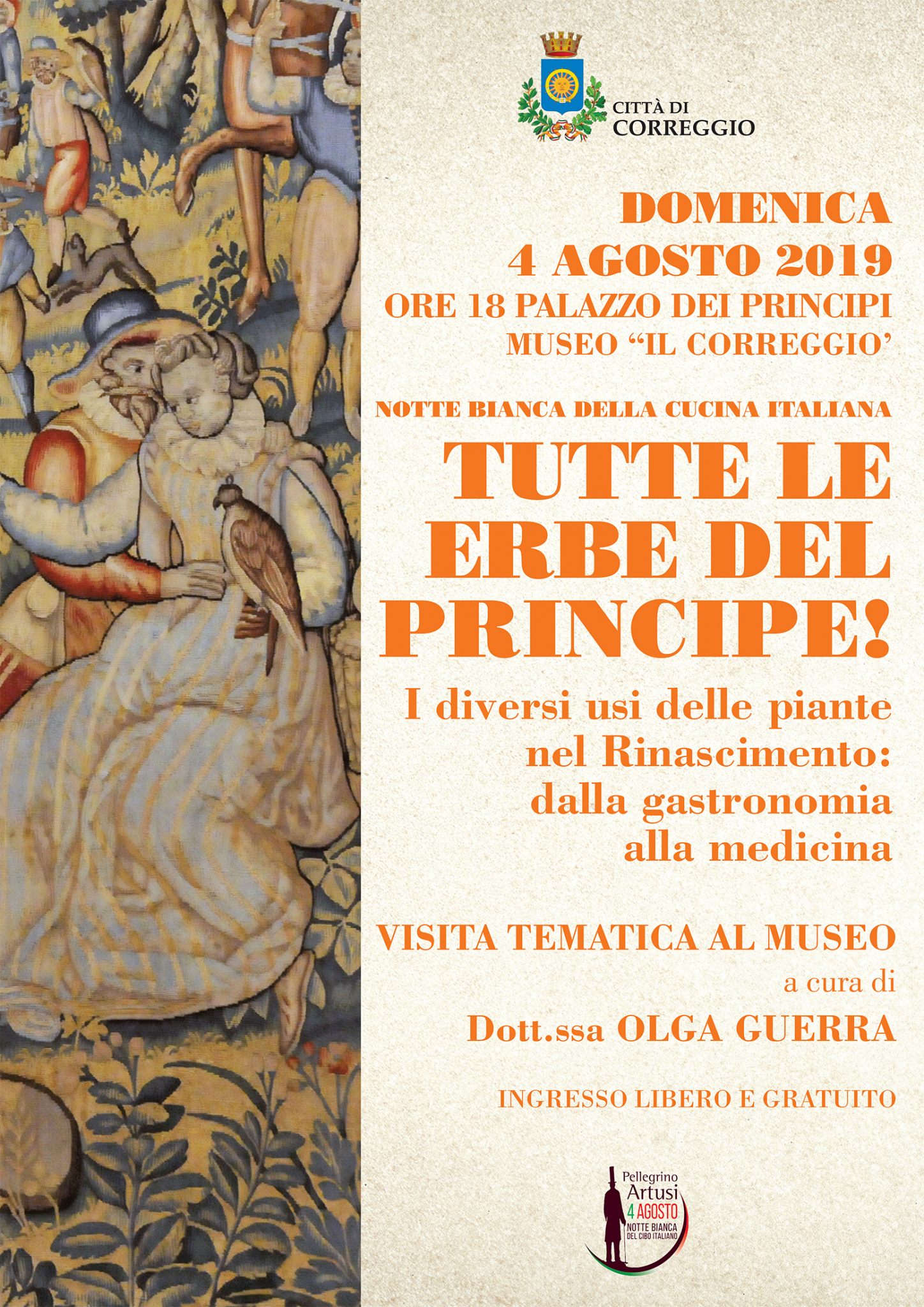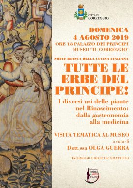 Tutte le Erbe del Principe Banner Correggio sarà il solo Comune emiliano a partecipare – domenica 4 agosto – alla seconda edizione della “Notte Bianca del Cibo Italiano”, manifestazione ideata per celebrare il compleanno di Pellegrino Artusi, originario di Forlimpopoli e considerato il padre della cucina italiana. Lo farà grazie a “Tutte le erbe del Principe: i diversi usi delle piante nel Rinascimento, dalla gastronomia alla medicina”, una speciale  visita guidata ai particolari legati alle erbe e alla gastronomia contenuti nelle opere d’arte esposte al Museo Il Correggio, a cura di Olga Guerra, in programma alle ore 18 (ingresso libero e gratuito).