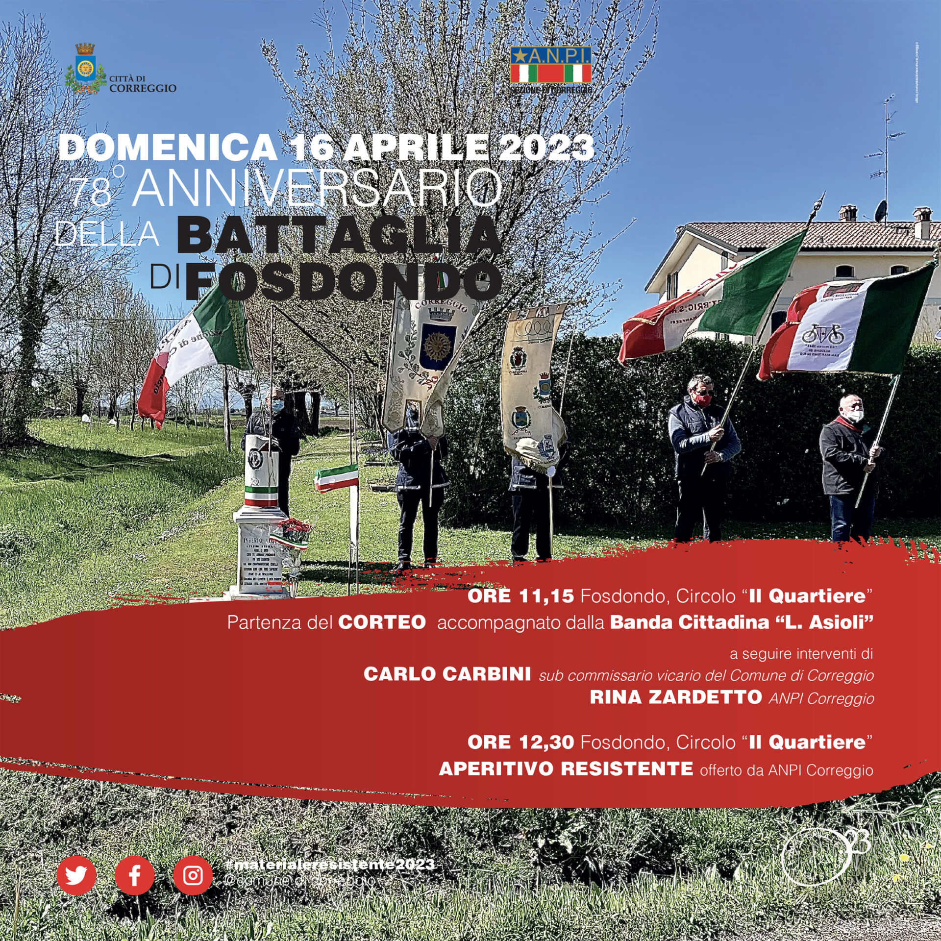 Il giorno seguente, domenica 16 aprile, la commemorazione per il 78esimo anniversario della “Battaglia di Fosdondo“: alle ore 11,15, con ritrovo al circolo Arci “Il Quartiere”, la partenza del corteo accompagnato dalla Banda Cittadina “L. Asioli”; a seguire “Aperitivo resistente“, offerto da Anpi Correggio.