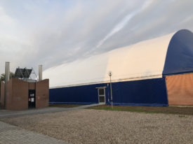 La nuova palestra è stata costruita adiacente alla già esistente Palestra Einaudi, per poter essere utilizzata sia dagli studenti del vicino polo scolastico superiore, sia da quelli delle altre scuole della nostra città. La struttura presenta una pianta di 45×27 metri, costituita da una struttura portante principale in legno lamellare. La copertura ha un’altezza di circa 11 metri, nel punto più alto dell’arco. Le chiusure delle due estremità sono state realizzate in blocchi in laterizio rivestite esternamente in muratura faccia a vista. La ventilazione e la climatizzazione dell’impianto sono garantite da un generatore di calore e, durante il periodo estivo, lo stesso sistema funziona come miscelatore, creando una maggior ventilazione. A completamento, sono stati realizzati un impianto d’illuminazione interna con un sistema di proiettori a LED, un impianto di illuminazione di emergenza, un sistema di rilevazione e allarme incendi e un impianto di messa a terra.