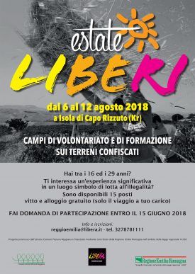“Estate Libera”: dal 6 al 12 agosto campo di volontariato a Isola di Capo Rizzuto, promosso da Unione Comuni Pianura Reggiana e “Libera”, per ragazzi dai 16 ai 29 anni.